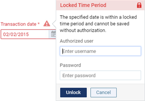If the payment is not already in a locked time period (based on your organization's transaction lock setting), and you attempt to backdate the payment to a date that would cause it to become locked, the Locked Time Period pop-up box appears. In the Authorized user and Password boxes, enter your credentials if you have permission to backdate transactions into locked time periods, or have someone with permission enter his or her credentials. Then, click Unlock.