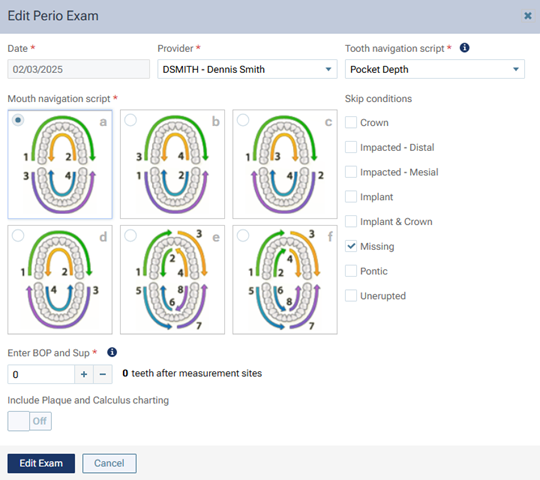 The options for editing the perio exam become available.