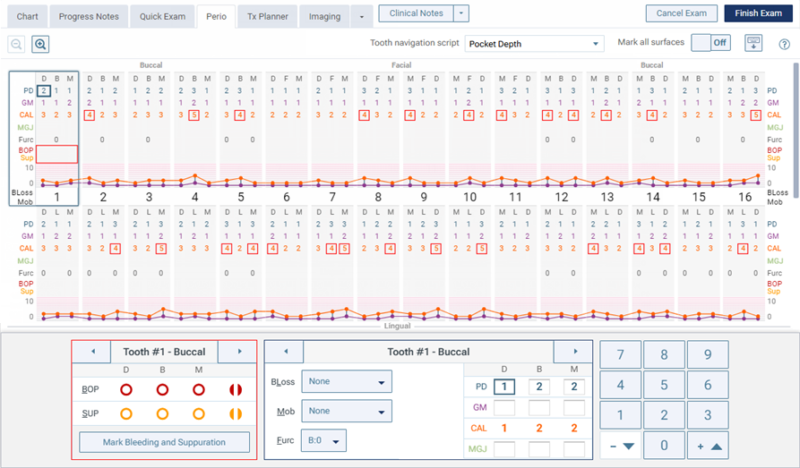 You can use the number buttons or keyboard keys to enter probing depths, gingival margins, mucogingival junctions, plaque (if applicable), and calculus (if applicable).