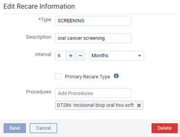 Procedures - Add the procedures that you want to associate with this recare type. Begin typing a procedure code or description, continue typing as needed to narrow the results, and then select the desired procedure from the list. Repeat this for as many procedures as you want to associate with this recare type. To remove a procedure, click (or tap) the Remove button