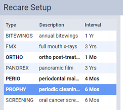 Every procedure that you will possibly post that is applicable to a given recare type must be associated with that recare type. For example, every prophy procedure that you use in your organization should be associated with a prophy recare type.
