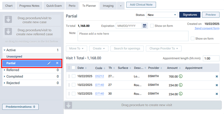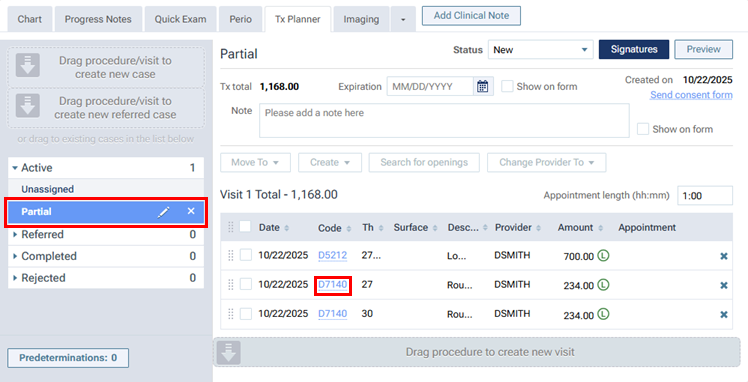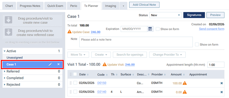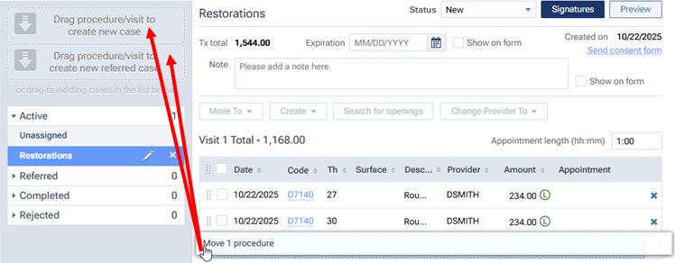 Note: Moving procedures from a referred case to an active case changes the status of those procedures from "Referred" to "Tx Plan."