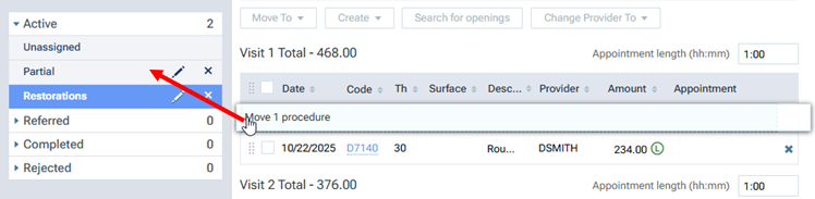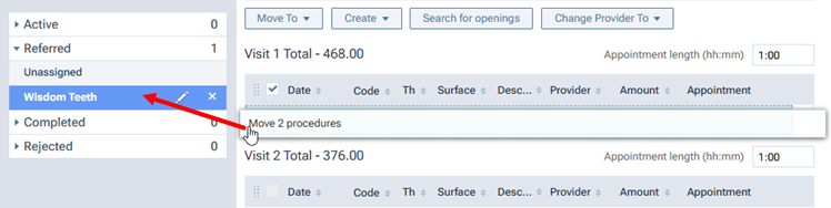 To move an individual procedure to an existing visit, drag that procedure (using the handle
