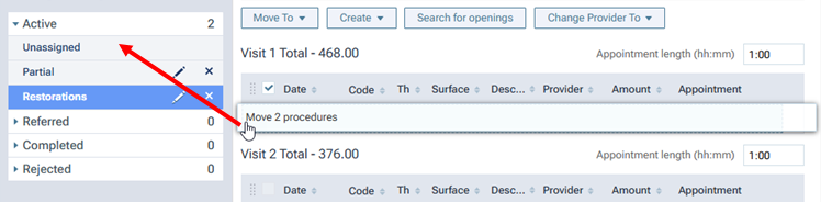 Note: Moving procedures from the "Referred - Unassigned" to the "Active - Unassigned" category changes the status of those procedures from "Referred" to "Tx Plan."