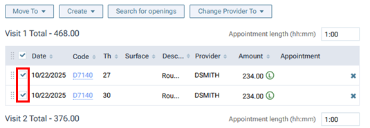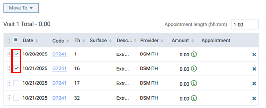 To move multiple procedures to an existing visit, select the checkboxes of those procedures.