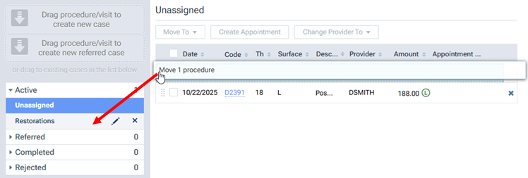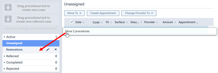 Note: Moving procedures from an active case to the "Referred - Unassigned" category changes the status of those procedures from "Tx Plan" to "Referred."