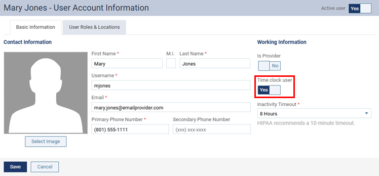 On the Basic Information tab, under Working Information, set the Time clock user switch to Yes.