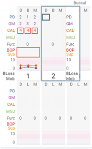 The MGJ selection frame stays inside the Tooth selection frame. The BOP/Sup selection frame advances with the Tooth selection frame but stays one tooth behind, so you cannot mark bleeding or suppuration while the first tooth is selected.