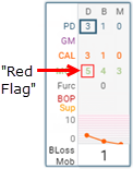 Note: For measurements that are critical (where MGJ minus PD is two or less), a red box appears around the number on the chart.