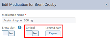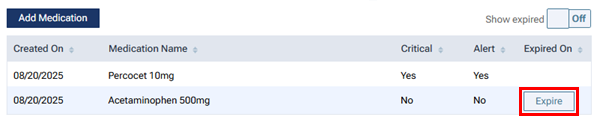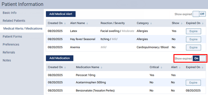 Note: You can view expired medications in the Medical Alerts/Medications section of a patient's Patient Information page by setting the medication list's Show expired switch to On.