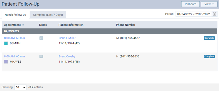 On the Needs Follow-Up tab, as you go down the list of appointments, use the phone number displayed to contact each patient, and then click (or tap) Complete next to the appointments for patients who you are able to follow up with.