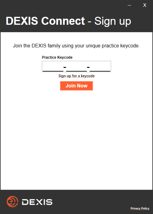 If a DEXIS Connect - Sign up dialog box appears, you can join DEXIS with a keycode; otherwise, close the dialog box.