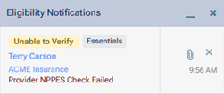 Eligibility verification notifications appear (as pop-ups in the lower-right corner) according to your subscriptions. However, even if you are subscribed to this type of notification, a notification appears only if you are logged in to Dentrix Ascend at the time the change that triggers that notification to be sent to you is made. Notifications are visible until you dismiss them or log out.
