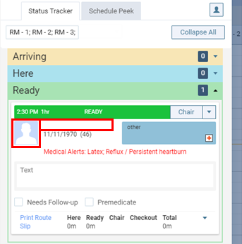 Patient names and patient pictures on appointment cards on the Status Tracker tab of the routing panel.
