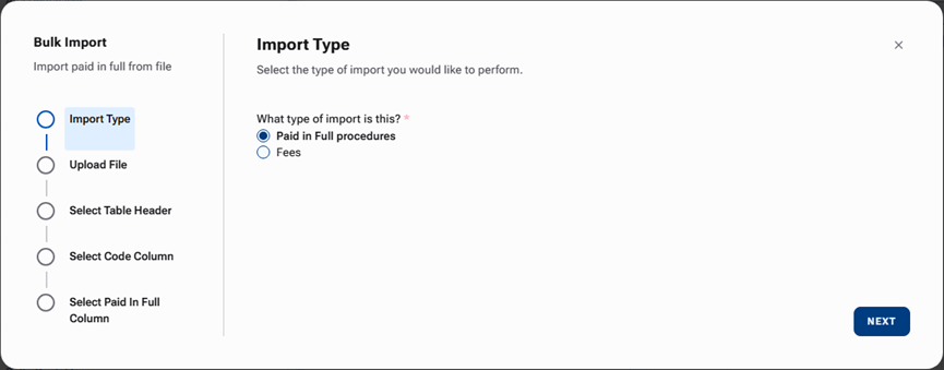 If the Paid in Full Enabled checkbox is selected for this fee schedule, the Import Type step is first.