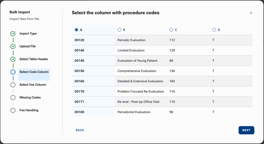 If the import must affect procedure fees, the .csv file must have a column with ADA Procedure Codes (each of which consists of a D prefix and four digits) and a column with fees (whole numbers, zeros expressed as decimal numbers, and positive decimal numbers are allowed).