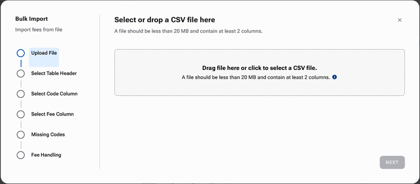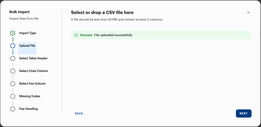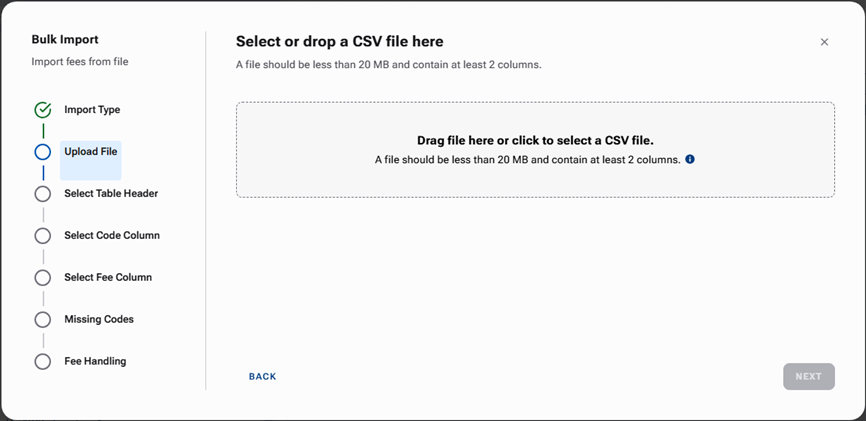 If the Paid in Full Enabled checkbox is clear for this fee schedule, the Upload File step is first.