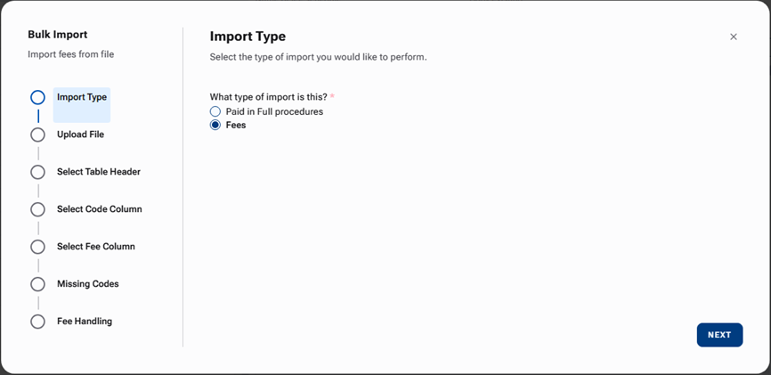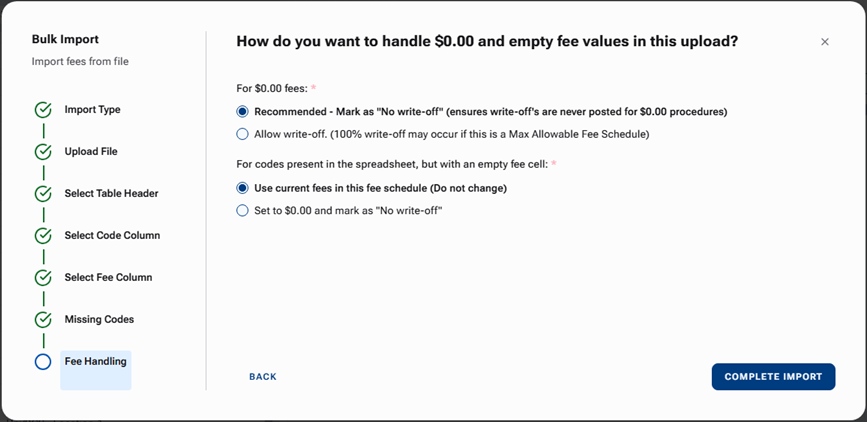 Fee Handling (available only if the import affects procedure fees).