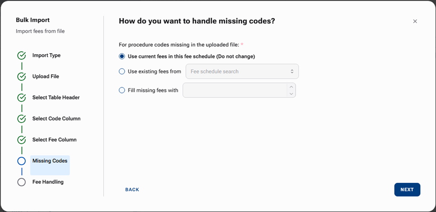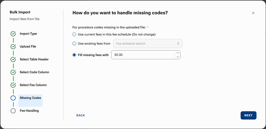 Specify how you want to handle any Missing Procedure Codes (procedures that might not exist in the Import Fee Schedule):