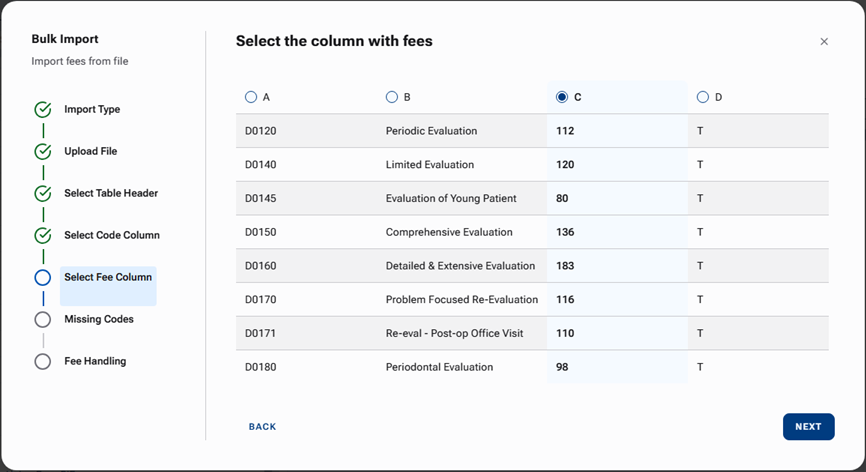 If the import must affect procedure fees, the .csv file must have a column with ADA Procedure Codes (each of which consists of a D prefix and four digits) and a column with fees (whole numbers, zeros expressed as decimal numbers, and positive decimal numbers are allowed).