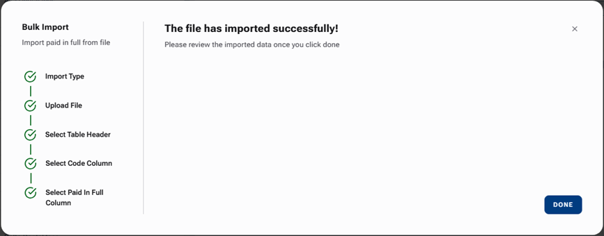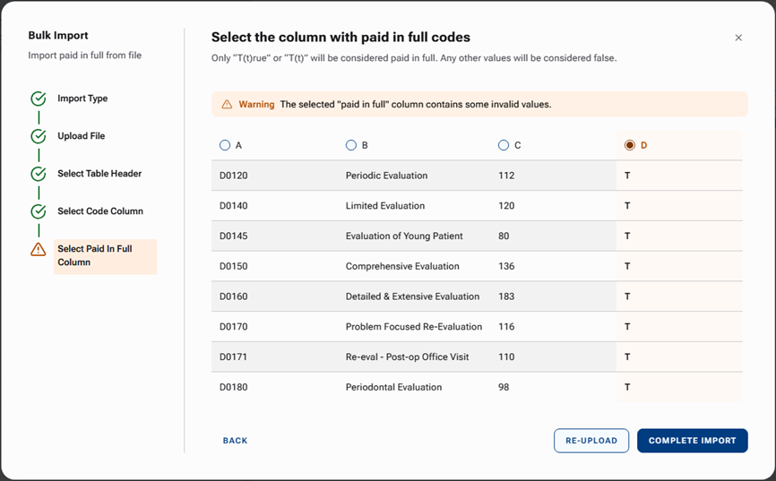 Note: If the import tool detects blank or invalid values in the selected column, a message appears. Those procedures will not be marked as "Paid in Full."
