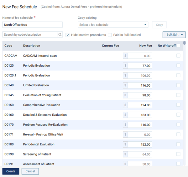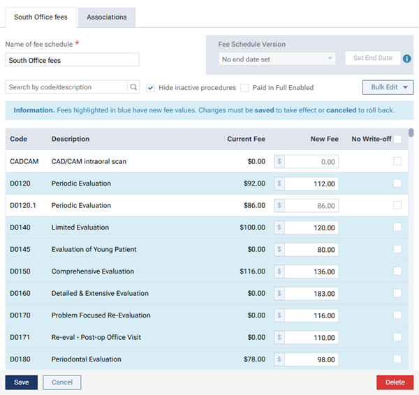 If you are creating a fee schedule, a procedure with an updated fee has a darker number in the box than a procedure whose fee was not updated).