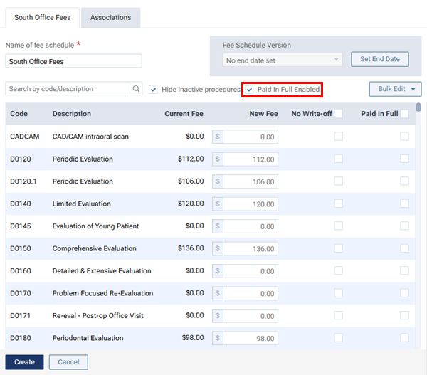 To enable "Paid in Full" procedures for the fee schedule, select the Paid in Full Enabled checkbox. With this checkbox selected, a Paid in Full column is available for the list of procedures.