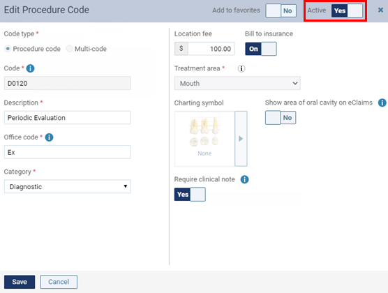 Procedure codes represent the services that you render and products that you sell at your locations. You can inactivate a procedure that you do not want to use so that it does not appear wherever procedure codes can be selected. Also, an inactive procedure code for a given location is not available for editing in fee schedules for that location.