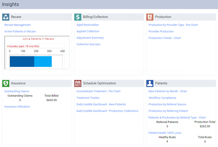 The Insights reports are a collection of reports that are important for monitoring the financial health of your practice.