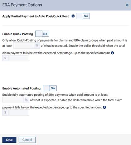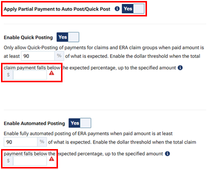 With the switch set to Yes, the automatic or quick posting of a partial payment for a claim on an ERA can occur if the approved payment amount on the ERA is (a) below the specified percentage of the amount expected from insurance but (b) more than the specified dollar amount threshold.