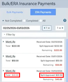 If the Total amount and the Split Approved amount for an ERA differ, the Total amount appears in red text to alert you of the discrepancy. This can happen if (1) there is a provider-level adjustment or (2) depending on your specified ERA delivery method, the payment is split between locations that share a tax ID. For example, if the total check is for $40, but it is split into two $20 payments for different locations, the split amount is $20 for each payment. This enhancement allows for easier tracking of claim payments and adjustments.