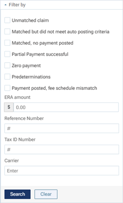 Matched, no payment posted - To include ERAs that were matched to claims but for which a payment has not been posted. With this checkbox clear, ERAs are included whether or not they were matched to claims and whether or not payments were posted.