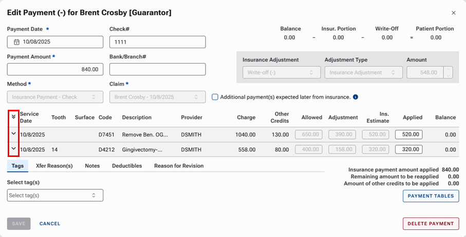 When you are editing an insurance payment, in the Edit Payment dialog box, expand each procedure for which you want to add and/or remove denial codes (by clicking, or tapping, the downward-pointing chevron), or expand all the procedures at once (by clicking, or tapping, the downward-pointing double chevron).