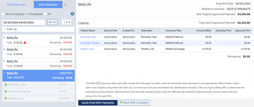 On the ERA Payments tab of a location's Bulk/ERA Insurance Payments page, click (or tap) an incomplete ERA on the left panel (as indicated by the Remaining amount being $0.00).