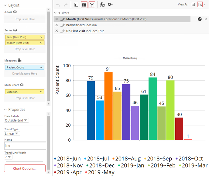 The New Patients by Month - Chart Report displays the number of new patients (based on the first visit date) that have visited your practice in the past 12 months. For each month, the report displays a colored, vertical bar whose height corresponds to the patient count.