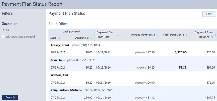 The Payment Plan Status Report allows you to review the status of all active payment plans or only those with a past due payment for the location that you are currently logged in to. You can use this report to help you contact guarantors who you need to collect money from. For each guarantor on the report, the following information appears: the name and phone number of the guarantor, the date and amount of the last payment, the starting date of the payment plan, the agreed upon payment amount (and interval), the total past due amount, and the balance of the payment plan.
