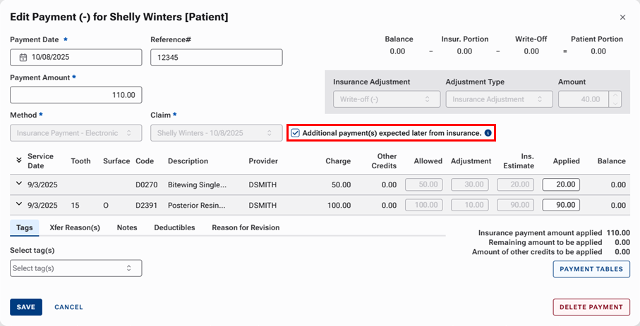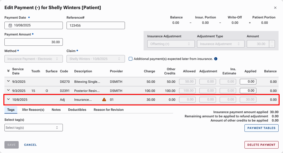 Note: In the insurance payment's Edit Payment dialog box, the adjustment also appears as a line item.