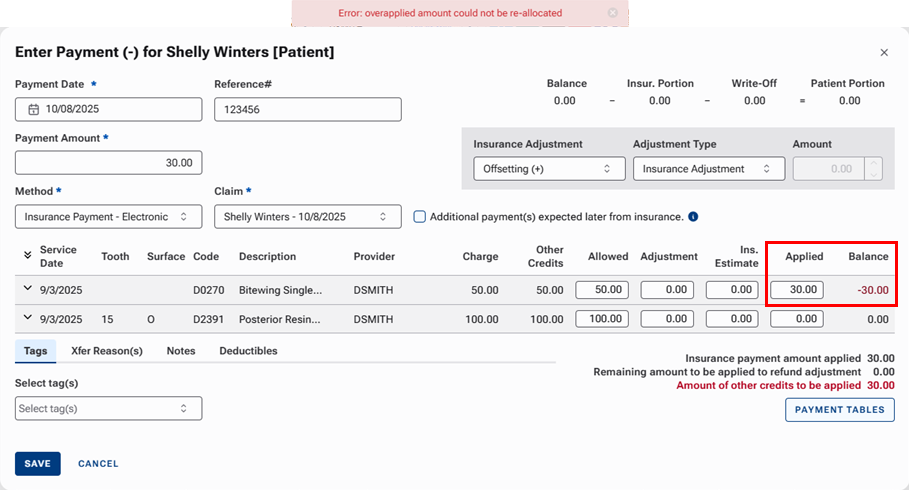 Note: If you attempt to save the payment while there is an amount greater than zero next to Amount of other credits to be applied, an error message appears. You cannot continue until you resolve the error.