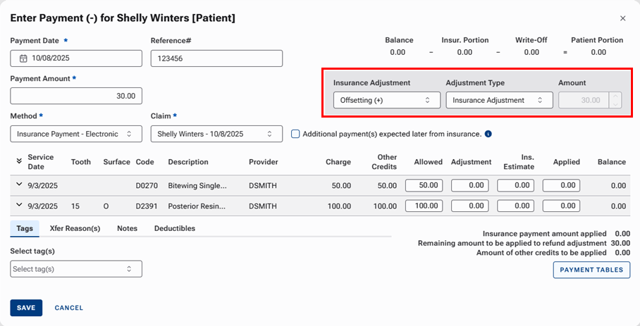From the Insurance Adjustment list, select Offsetting (+). The carrier wants a refund, or your office wants to keep the money and process adjustments.