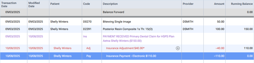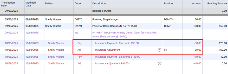 The insurance payment and adjustment appear on the ledger. The adjustment is automatically associated with the billing provider for the claim, which may not be the correct provider (for instance, if the billing provider is a location).