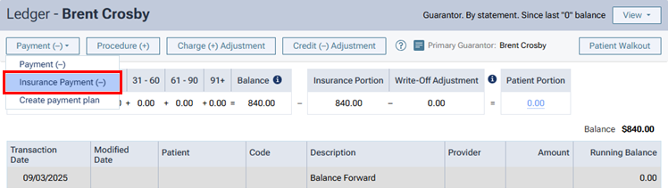 On a patient's Ledger page, click (or tap) Payment, and then select Insurance Payment.
