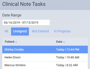 Click (or tap) the Unsigned column of the Clinical Note Tasks box. A clinical note is considered to be unsigned by you if you are the primary provider and have not signed it.