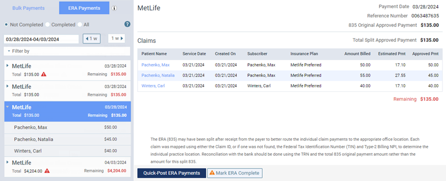 On the left panel, the patient name and payment amount of each claim that pertains to the selected ERA appears.