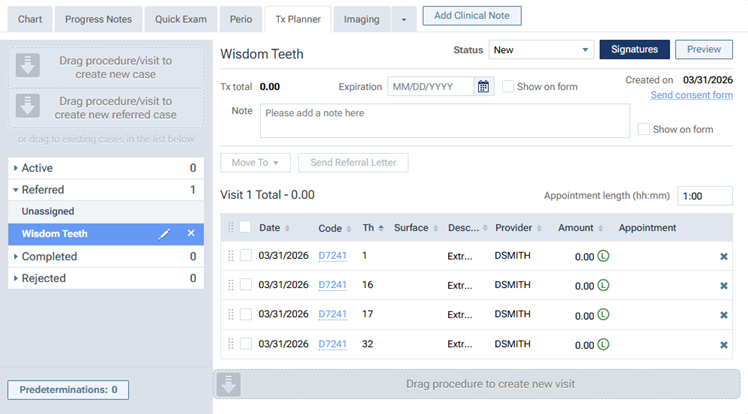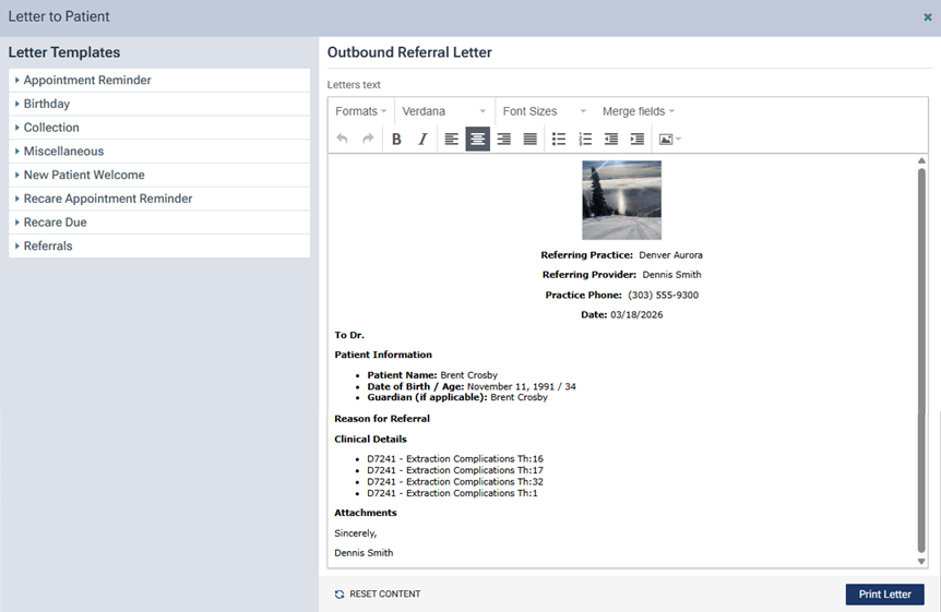 You can quickly create and send a custom patient letter for treatment being referred out to another doctor. The letter can include practice information, patient information, referral details (such as the reason for the referral and the procedures being referred), and images.