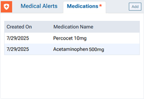 On a patient's Overview page, the Medications tab of the Medical Alerts/Medications box displays any medications that have been entered for the patient. Select a medication.