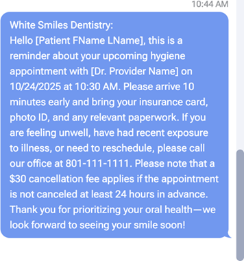Twillio (the third-party text messaging service used by Dentrix Ascend) recommends sending 320 or less to avoid errors, increase reliability of sending, improve readability, and decrease the chance that message segments will arrive out of order. The following image is an example of a message with 590 characters: