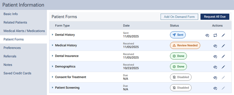 Dentrix Ascend provides an online portal where patients can complete forms. In addition, to requesting all forms that are due based on each form's frequency setting, you can send or resend a request for a specific patient form to be completed.