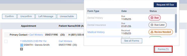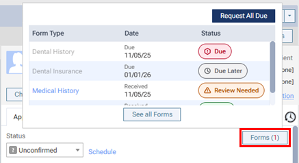 While confirming a patient's appointment, click (or tap) Forms to view a pop-up box that displays the published patient forms that are applicable for the patient. If any forms have a "Due" Status, click (or tap) Request All Due.