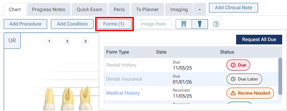 On the Chart tab of a patient's clinical record, click (or tap) Forms to view a pop-up box that displays the published patient forms that are applicable for the patient. If any forms have a "Due" Status, click (or tap) Request All Due.