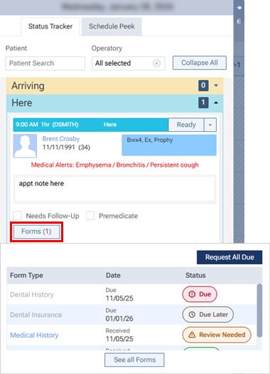 On the routing panel, locate a patient's appointment card, and then click (or tap) Forms to view a pop-up box that displays the published patient forms that are applicable for the patient. If any forms have a "Due" Status, click (or tap) Request All Due.